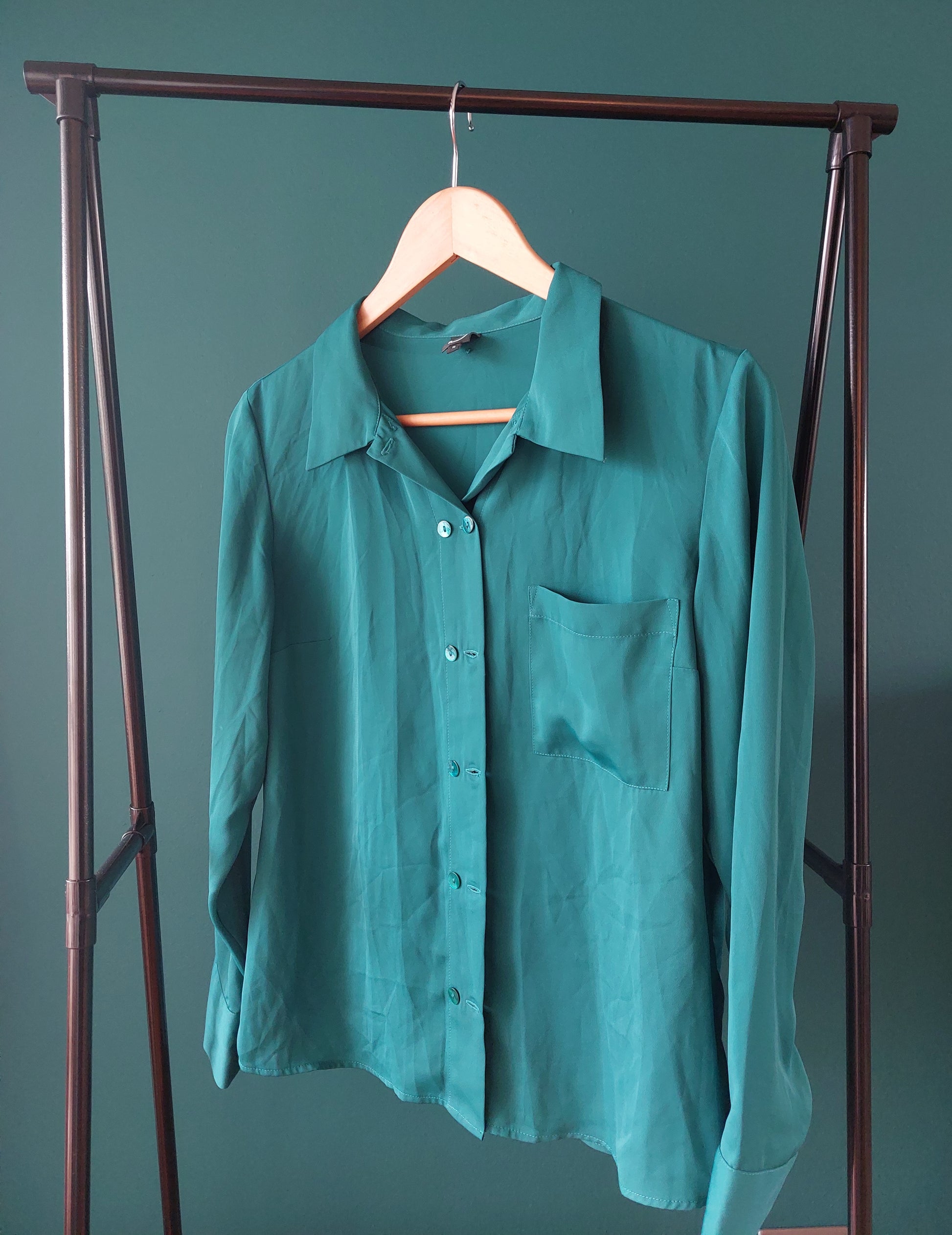 Blusa de corte clásico, abotonada, en color verde, marca IO.