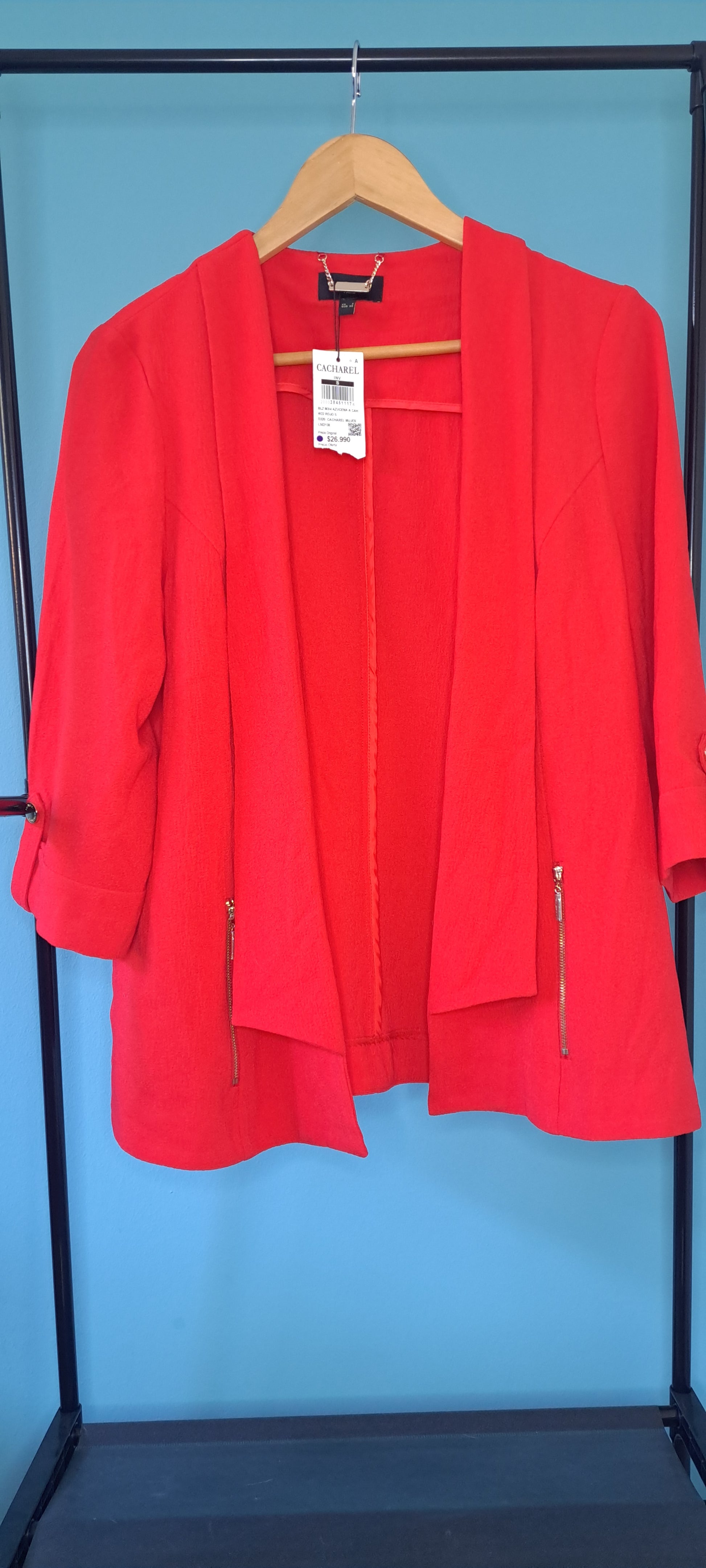 El rojo es uno de los colores que le quedan a todas...aquí chaqueta holgada ultra cómoda, excelente complemento y con etiqueta!